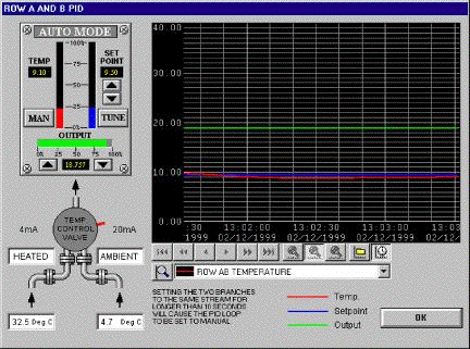 This screen allows the operator to choose a setpoint, choose manual or PID control, change PID tuning parameters, force the output to a particular value, etc. Temperature is controlled by a mixing valve assembly that mixes a warm and cold stream to arrive at the desired temperature. The Opto22 controller sends a 4-20 mA control signal to the valve assembly, which converts this to % open and closed for the two metering valves that are contained within. |